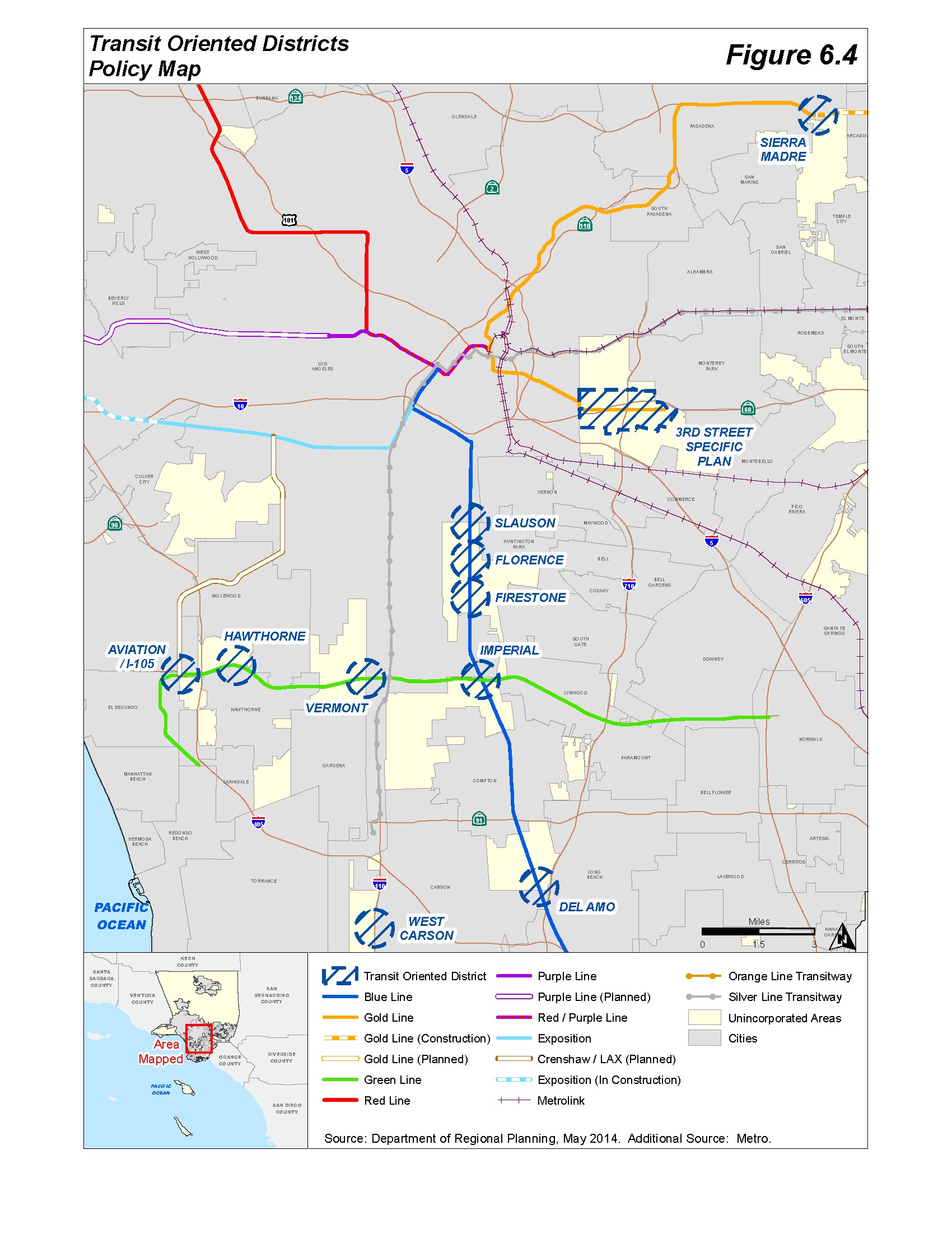 Description: This layer represents the proposed Transit Oriented Districts as depicted in Figure 6.5 in the General Plan 2035. These are urban and suburban areas with access to major transit and commercial corridors that have the most potential for infill development, and are well-suited for higher density housing and mixed uses. With the exception of the East Los Angeles 3rd Street Specific Plan, all of these are 1/2 mile buffers around a major transit stop.UPDATE HISTORY:10/18/18 - Updated for adoption of Willowbrook TOD Specific Plan which went into effect on this date.10/31/19 - Updated for adoption of West Carson TOD Specific Plan which went into effect on this date.7/1/20 - Updated for the adoption of the Connect Southwest LA TOD Specific Plan in West Athens - Westmont.3/10/23 - Updated for the adoption of the Florence-Firestone TOD Specific Plan.4/22/25 - Updated for the adoption of the South Bay Area Plan on 3/11/25 (effective on 4/10/25), adjusting the boundary of the West Carson TOD Specific Plan to include Alpine Village.9/25/25 - Shifted Aviation Station buffer as the center of the buffer did not match the exact location of the station.